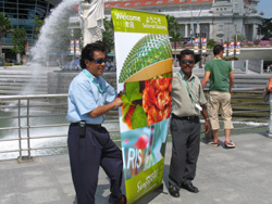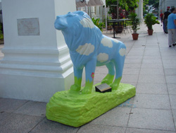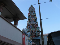 | bunter Löwe am Fuße der Raffles-Statue | Blick auf den indischen Tempel |